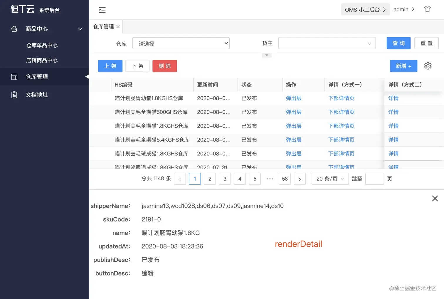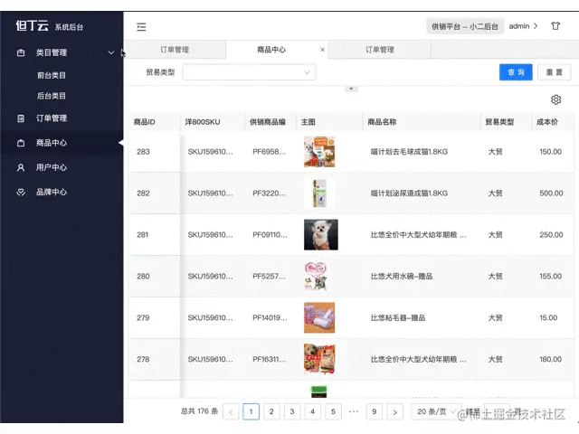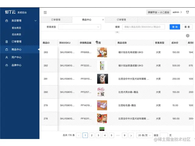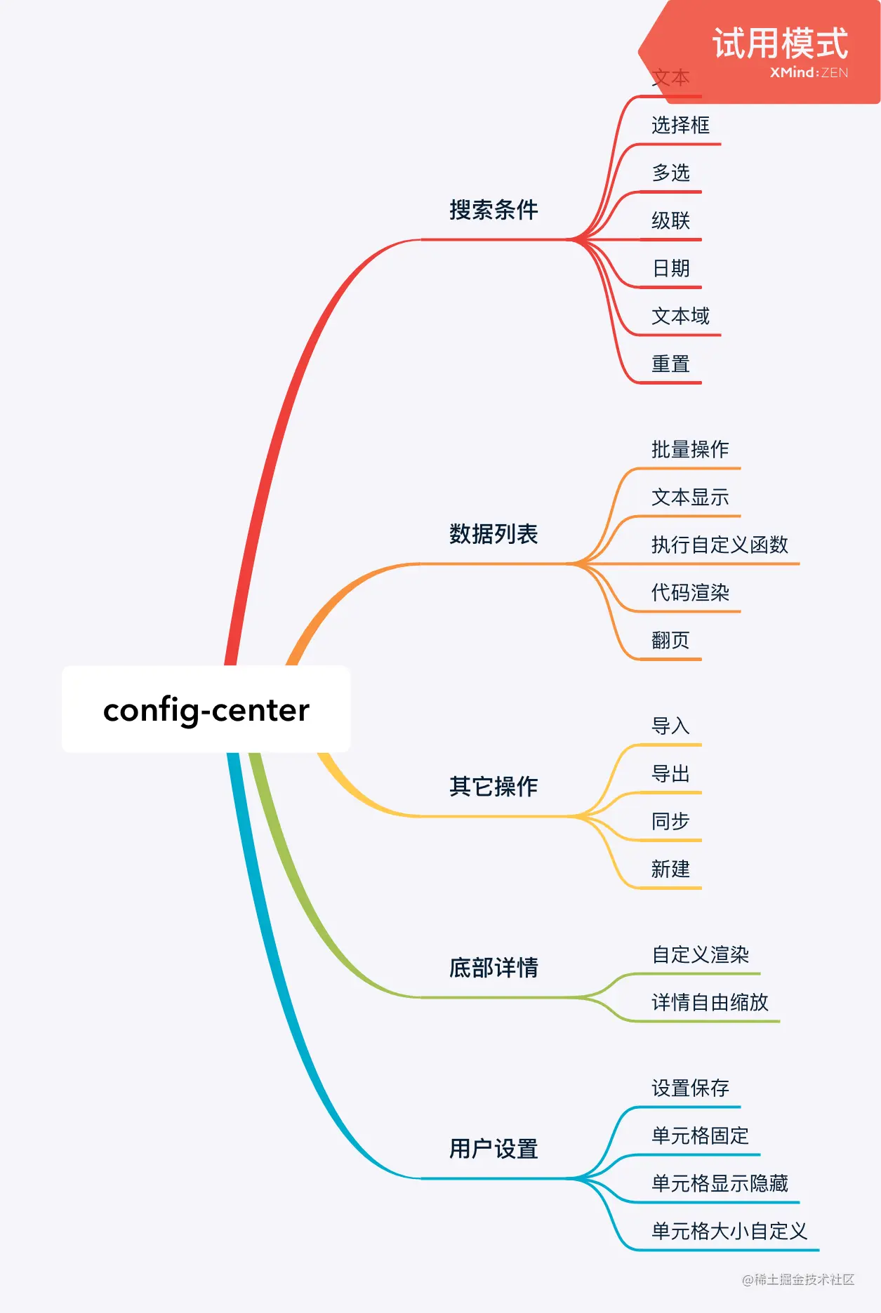 对于后台类应用,会有很多列表查询类的页面,他的格式比较固定,统一。上面是各种类型的搜索条件,下面是表格。表格列宽可拖动,列可排序,固定在左,或者右侧,也可以隐藏等。表格可带批量操作,底部可以出详情,等等,很多的操作。对于这一类共性的需求,可使用ConfigCenter快速生成页面,或者通过继承ConfigCenter,使用ConfigCenter提供的API接口,用少量代码开发来生成页面。