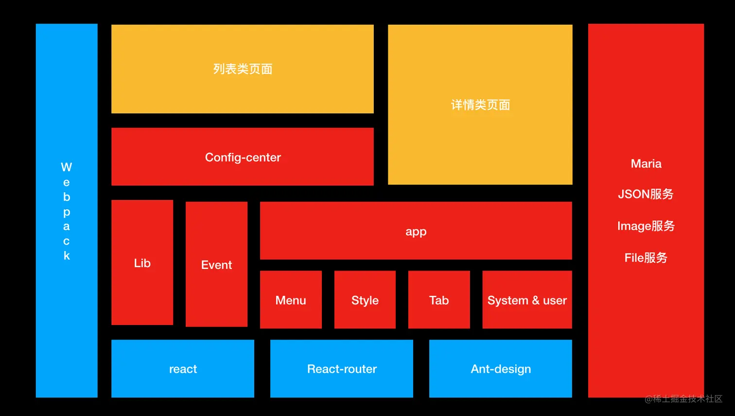 react-single-app框架,大量使用配置来生成应用以及页面,以此来简化前端开发的工作。该应用配置可以由服务端提供,当然更多的是使用公司自研的maria系统来提供。整个架构图,如下图所示