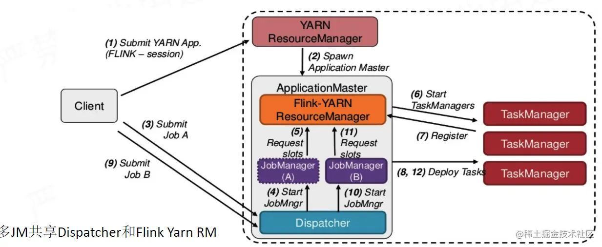 2.当作业到 Dispatcher 后,Dispatcher 会首先启动一个 JobManager 组件,然后 JobManager 会向 ResourceManager 申请资源来启动作业中具体的任务。如果是Session模式,则TaskManager已经启动了,就可以直接分配资源。如果是per-Job模式,ResourceManager 也需要首先向外部资源管理系统申请资源来启动 TaskExecutor,然后等待 TaskExecutor 注册相应资源后再继续选择空闲资源进程分配,JobManager 收到 TaskExecutor 注册上来的 Slot 后,就可以实际提交 Task 了。