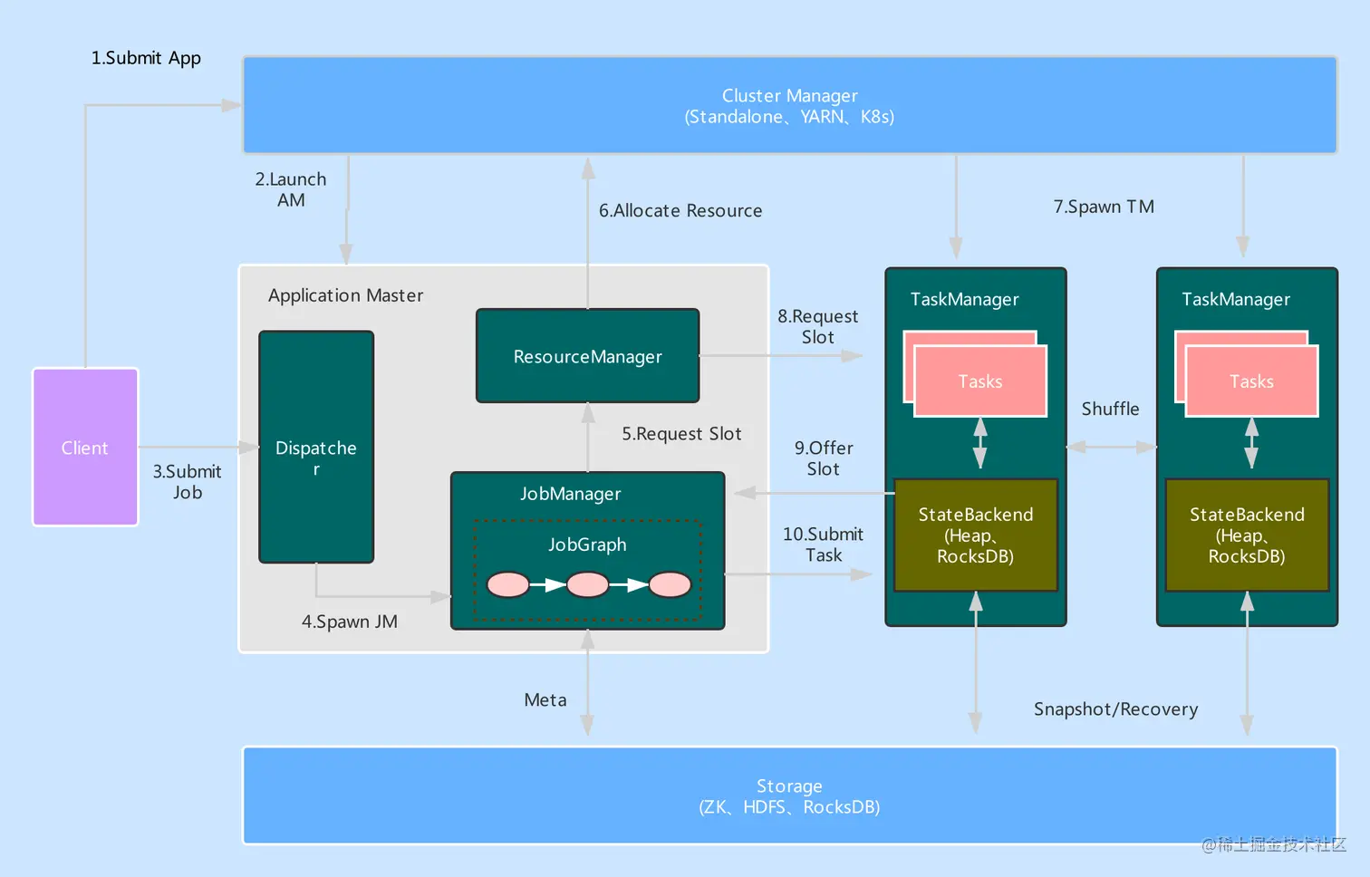 Application Master 部分包含了三个组件,即 Dispatcher、ResourceManager 和 JobManager。其中,Dispatcher 负责接收用户提供的作业,并且负责为这个新提交的作业拉起一个新的 JobManager 组件。ResourceManager 负责资源的管理,在整个 Flink 集群中只有一个 ResourceManager。JobManager 负责管理作业的执行,在一个 Flink 集群中可能有多个作业同时执行,每个作业都有自己的 JobManager 组件。这三个组件都包含在 AppMaster 进程。
