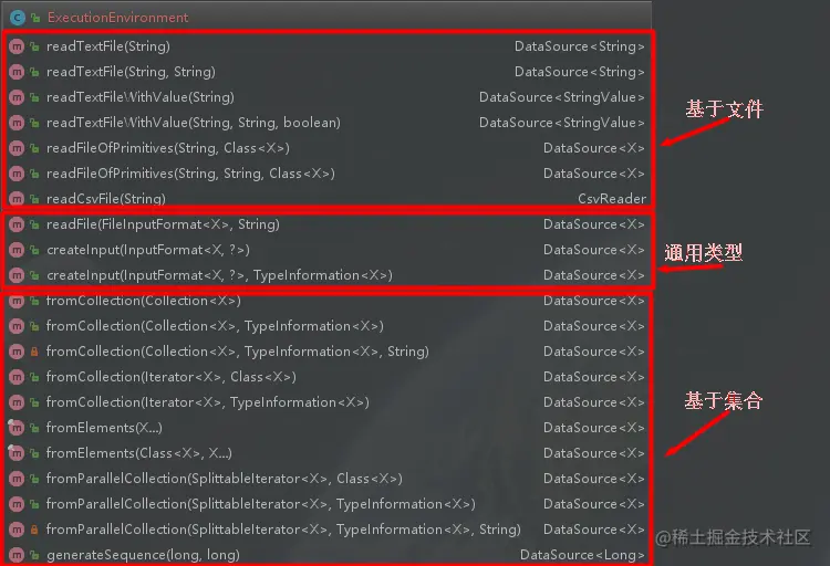 DataSet API支持从多种数据源中将批量数据集读到Flink系统中,并转换成DataSet数据集。主要包括三种类型:分别是基于文件的、基于集合的及通用类数据源。同时在DataSet API中可以自定义实现InputFormat/RichInputFormat接口,以接入不同数据格式类型的数据源,比如CsvInputFormat、TextInputFormat等。从ExecutionEnvironment类提供的方法中可以看出支持的数据源方法,如下图所示: