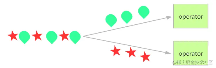 DataStream → SplitStream,将流分割成两条或多条流,与union相反。分割之后的流与输入流的数据类型一致, 对于每个到来的事件可以被路由到0个、1个或多个输出流中。可以实现过滤与复制事件的功能,DataStream.split()接收一个OutputSelector函数,用来定义分流的规则,即将满足不同条件的流分配到用户命名的一个输出。