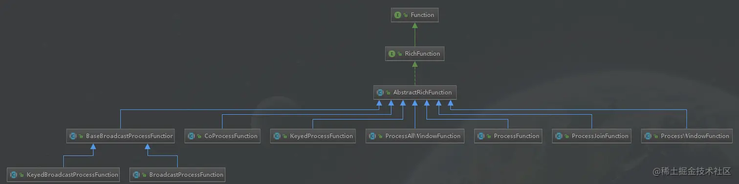 * 另外,KeyedProcessFunction的父类AbstractRichFunction实现了RichFunction接口,所以,可以使用