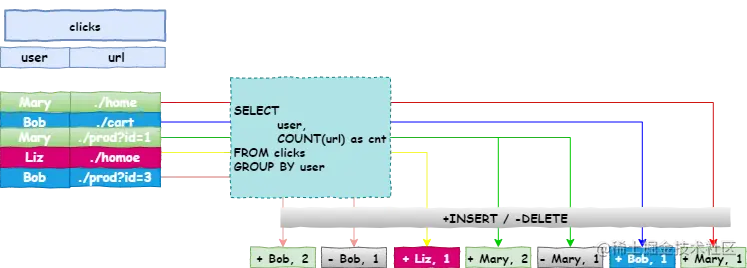 INSERT,UPDATE和DELETEDML操作语句的结果,通常被称为changelog stream(更新日志流)。 - 一个物化视图由一个查询语句进行定义。为了更新雾化视图,查询会连续处理雾化视图的变更日志流。