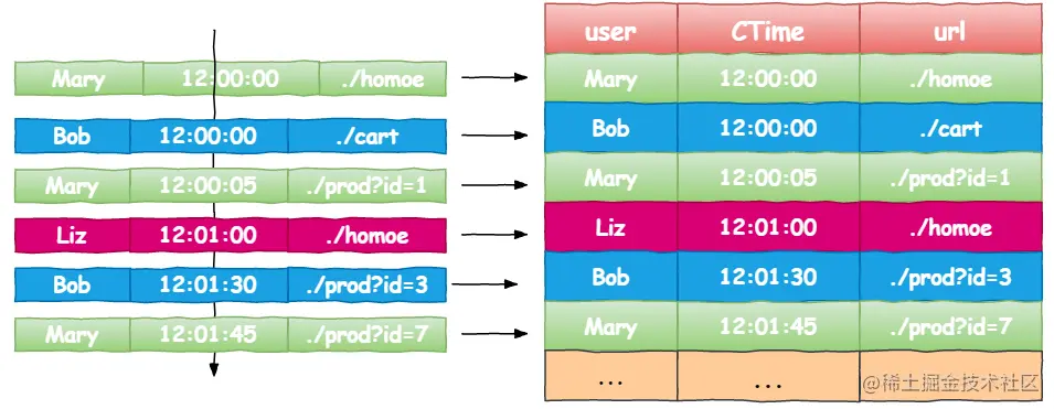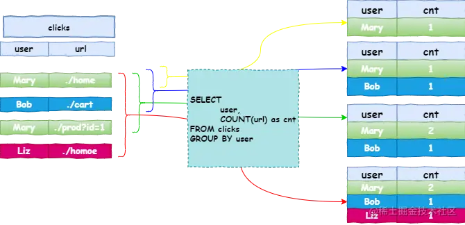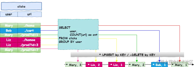 上图中展示了一个用户点击行为的数据,计算操作使用的是分组聚合(group aggregation)。当第一条数据[Mary,./home]进来时,会立即进行计算操作,并输出计算结果:[Mary,1]。当[Bob,./cart]进来时,也会立即进行计算,并输出计算结果:[Mary,1],[Bob,1]。当[Mary,./prod?id=1]进来时,会立即进行计算,并输出结果:[Mary,2],[Bob,1]。由此可以看出:分组聚合会作用在所有的数据上,并且会更新之前输出的结果。