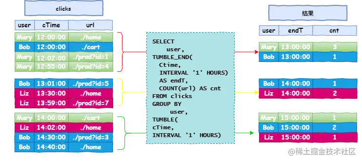 上面演示的是一个分组聚合的案例,下面再来看一个窗口聚合的案例。按照一个小时的滚动窗口(Tumble Window)计算该一小时内的用户点击情况,具体如下图所示: