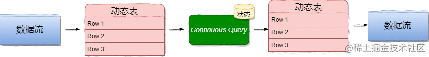 关于流、动态表与Continuous Query之间的关系,如下图所示: