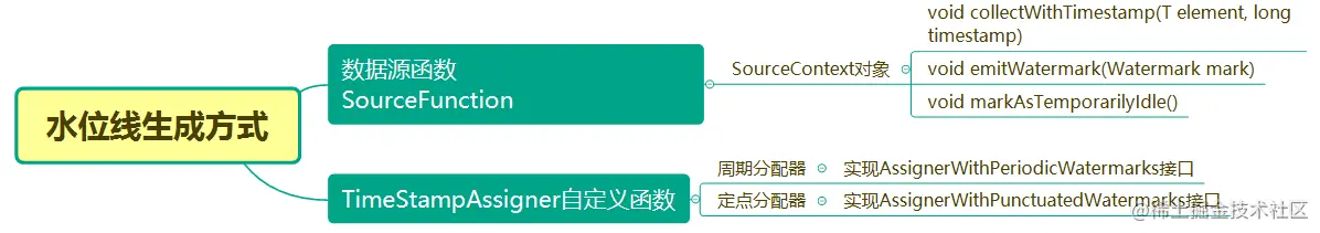 通常情况下,在接收到数据源之后应该马上为其生成水位线,即越靠近数据源越好。Flink提供两种方式生成水位线,其中一种方式为在数据源完成的,即利用SourceFunction在应用读入数据流的时候分配时间戳与水位线。另一种方式是通过实现接口的自定义函数,该方式又包括两种实现方式:一种为周期性生成水位线,即实现AssignerWithPeriodicWatermarks接口,另一种为定点生成水位线,即实AssignerWithPunctuatedWatermarks接口。具体如下图所示: