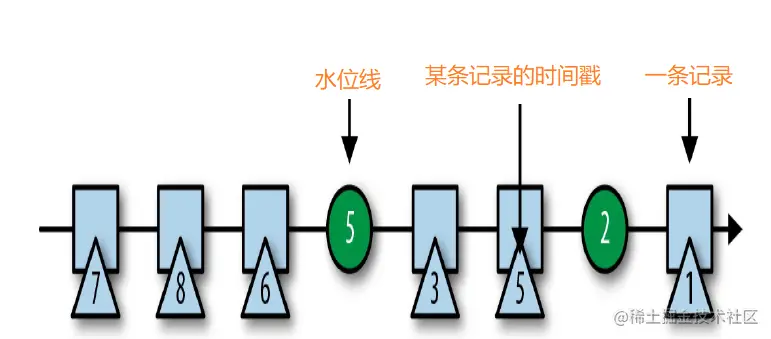 如上图,矩形表示一条记录,三角表示该条记录的时间戳(真实发生时间),圆圈表示水位线。可以看到上面的数据是乱序的,比如当算子接收到为2的水位线时,就可以认为时间戳小于等于2的数据都已经到来了,此时可以触发计算。同理,接收到为5的水位线时,就可以认为时间戳小于或等于5的数据都已经到来了,此时可以触发计算。