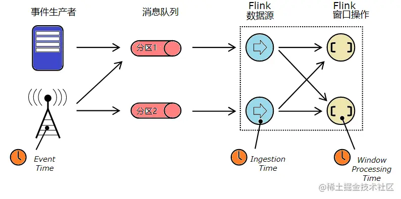 时间是Flink等流处理中最重要的概念之一,在 Flink 中 Time 可以分为三种:Event-Time,Processing-Time 以及 Ingestion-Time,如下图所示: