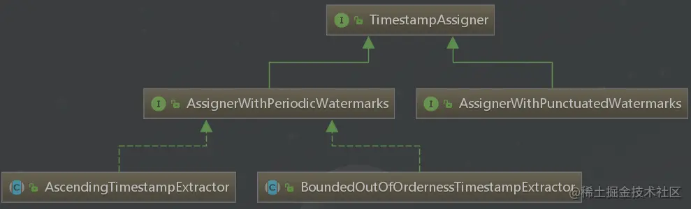 通过查看TimestampAssignerd 继承关系可以发现(继承关系如下图),除此之外,Flink还提供了两种内置的水位线分配器,分别为:AscendingTimestampExtractor和BoundedOutOfOrdernessTimestampExtractor两个抽象类。