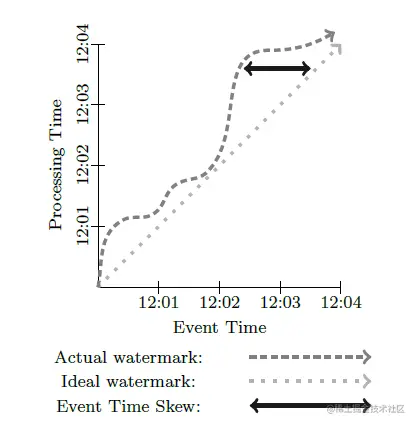 上图的浅灰色直虚线表示理想的水位线,深灰色的弯曲虚线表示现实中的水位线,黑色直线表示两者之间的偏差。在理想状态下,这种偏差为0,因为总是在时间发生时就会立即处理,即事件的真实时间与处理事件的时间是一致的。比如,12:01产生的事件刚好在12:01时被处理,12:02产生的事件刚好在12:02时被处理。但是现实总会有迟到的数据产生,比如网络延迟的原因,所以真实的情况会像深灰色的弯曲虚线表示的那样,即12:01产生的数据可能会在12:01之后被处理,12:02产生的数据在12:02时被处理,12:03时产生的数据会被在12:03之后处理。这种动态的偏差在分布式处理系统中是非常常见的。