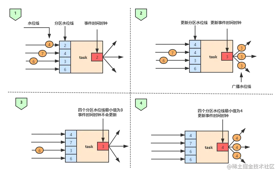如上图,一个任务会为它的每个分区都维护一个分区水位线(partition watermark),当收到每个分区传来的水位线时,任务首先会让当前分区水位线的值与接收的水位线值相比较,如果新接收的水位线值大于当前分区水位线值,则会将对应的分区水位线值更新为较大的水位线值(如上图中的2步骤),接着,任务会把事件时钟调整为当前分区水位线值的最小值,如上图步骤2 ,由于当前分区水位线的最小值为3,所以将事件时间时钟更新为3,然后将值为3的水位线广播到下游任务。步骤3与步骤4的处理逻辑同上。