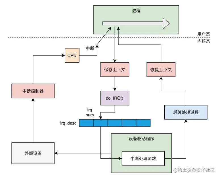 中断是从外部设备发起的,会形成外部中断。外部中断会到达中断控制器,中断控制器会发送中断向量 Interrupt Vector 给 CPU。