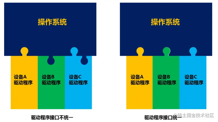 设备驱动程序中是一些面向特殊设备控制器的代码。不同的设备不同。但是对于操作系统其它部分的代码而言,设备驱动程序应该有统一的接口。就像下面图中的一样,不同的设备驱动程序,可以以同样的方式接入操作系统,而操作系统的其它部分的代码,也可以无视不同设备的区别,以同样的接口调用设备驱动程序。