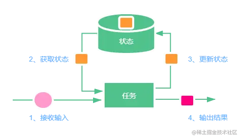 从上面的两个例子可以看出,在使用Spark进行词频统计时,当前的统计结果不受历史统计结果的影响,只计算接收的当前数据的结果,这个就可以理解为无状态的计算。再来看一下Flink的例子,可以看出当第二次词频统计时,把第一次的结果值也统计在了一起,即Flink把上一次的计算结果保存在了状态里,第二次计算的时候会先拿到上一次的结果状态,然后结合新到来的数据再进行计算,这就可以理解成有状态的计算,如下图所示。