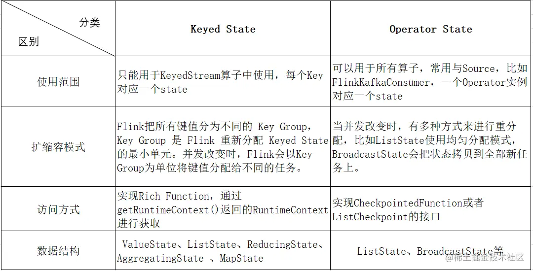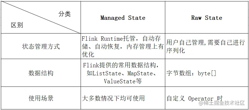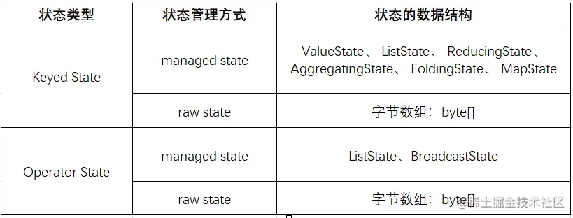 Flink提供了两种基本类型的状态:分别是 Keyed State 和Operator State。根据不同的状态管理方式,每种状态又有两种存在形式,分别为:managed(托管状态)和raw(原生状态)。具体如下表格所示。需要注意的是,由于Flink推荐使用managed state,所以下文主要讨论managed state,对于raw state,本文不会做过多的讨论。