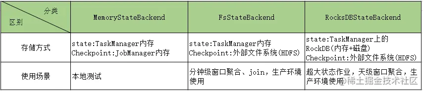 RocksDBStateBackend在性能上要比FsStateBackend高一些,主要是因为借助于RocksDB存储了最新热数据,然后通过异步的方式再同步到文件系统中,但RocksDBStateBackend和MemoryStateBackend相比性能就会较弱一些。