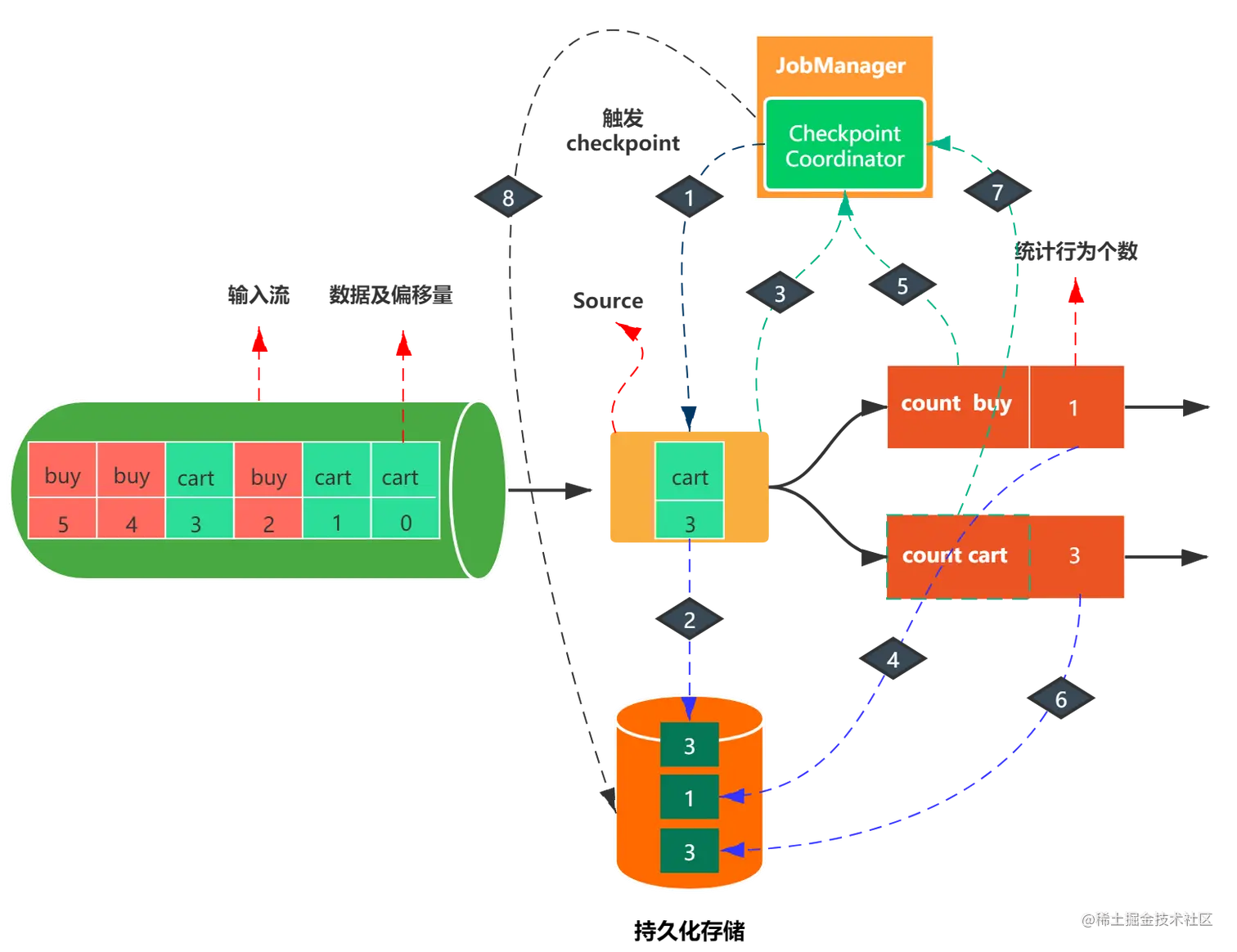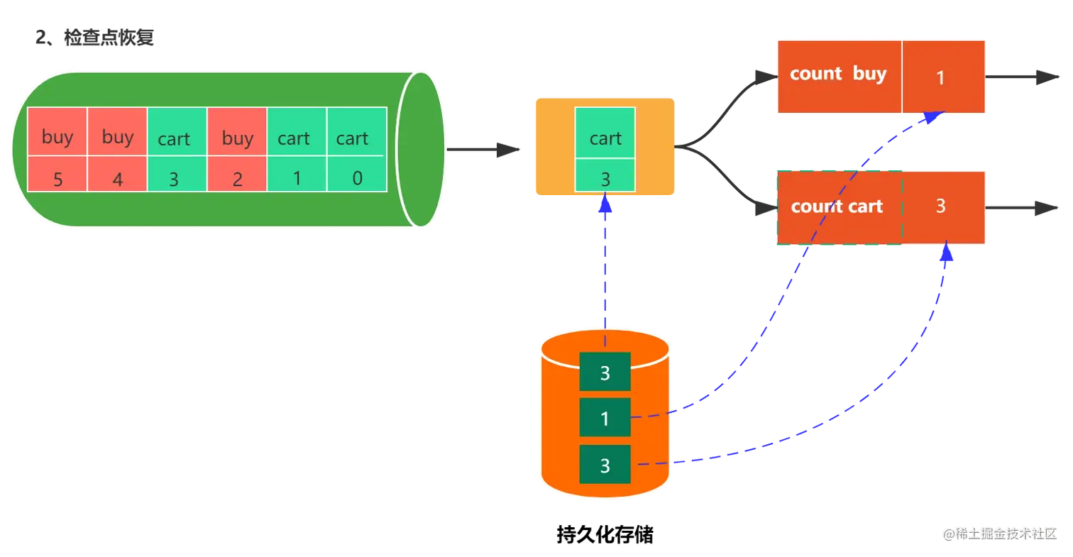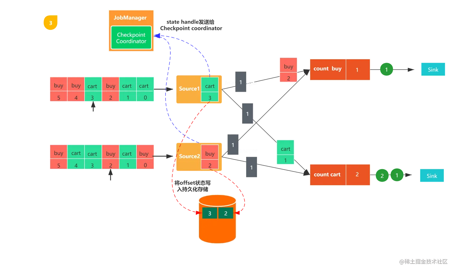 第二步:假设当消费到[cart,3]这条数据时,触发了checkpoint。那么此时数据源会把消费的偏移量3写入持久化存储。