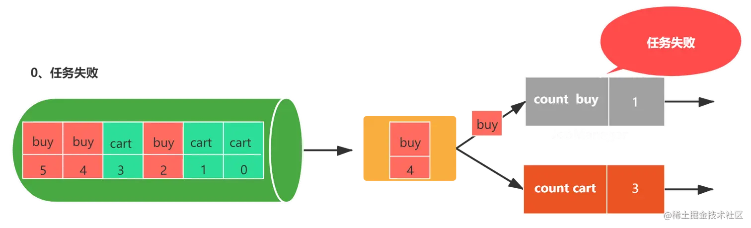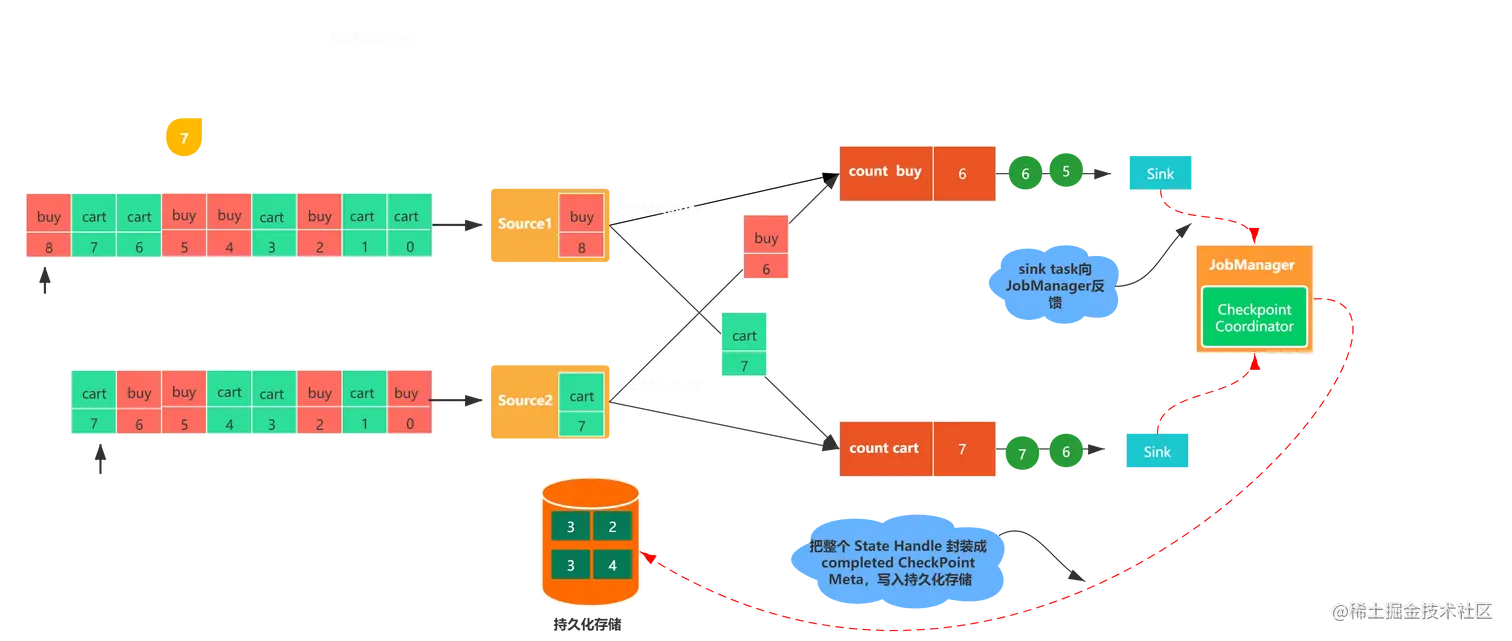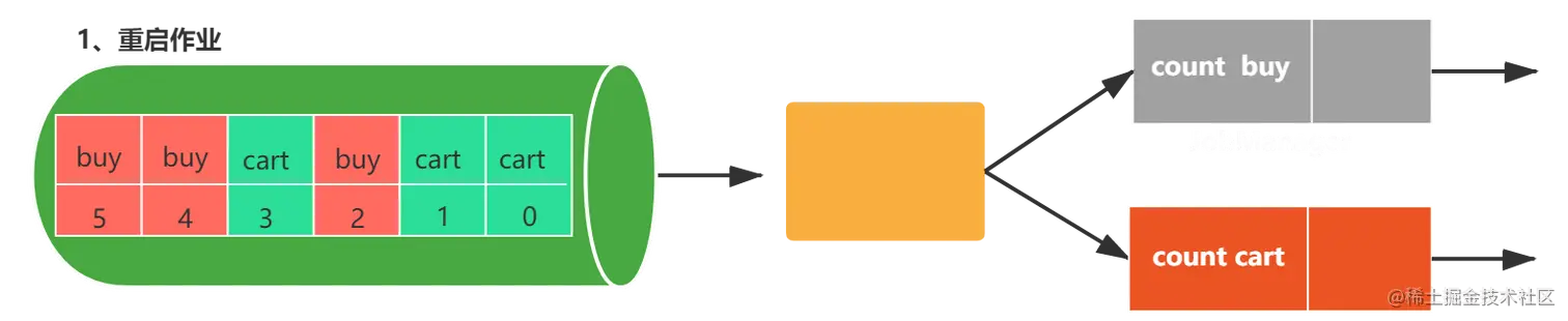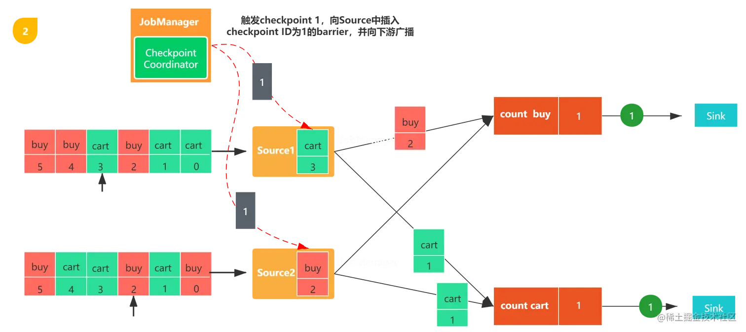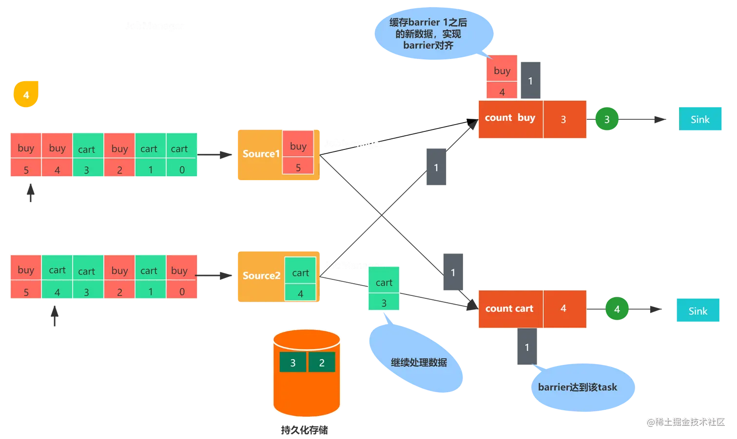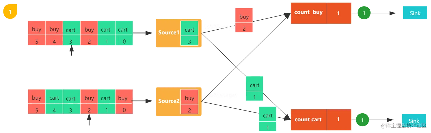 图1,包括两个流,每个任务都会消费一条用户行为数据(包括购买(buy)和加购(cart)),数字代表该数据的偏移量,count buy任务统计购买行为的个数,coun cart统计加购行为的个数。