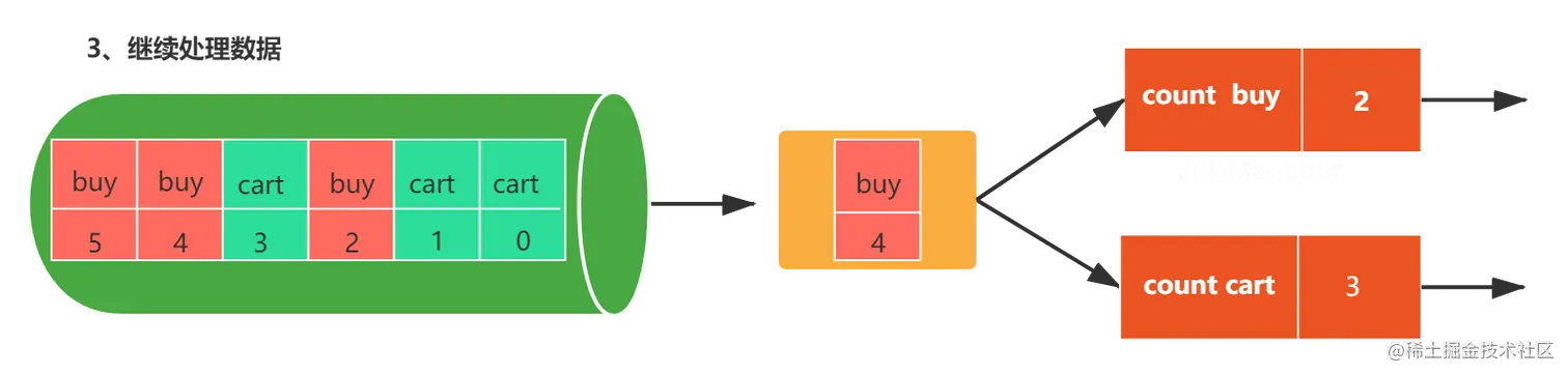 如上图,输入流是用户行为数据,包括购买(buy)和加入购物车(cart)两种,每种行为数据都有一个偏移量,统计每种行为的个数。