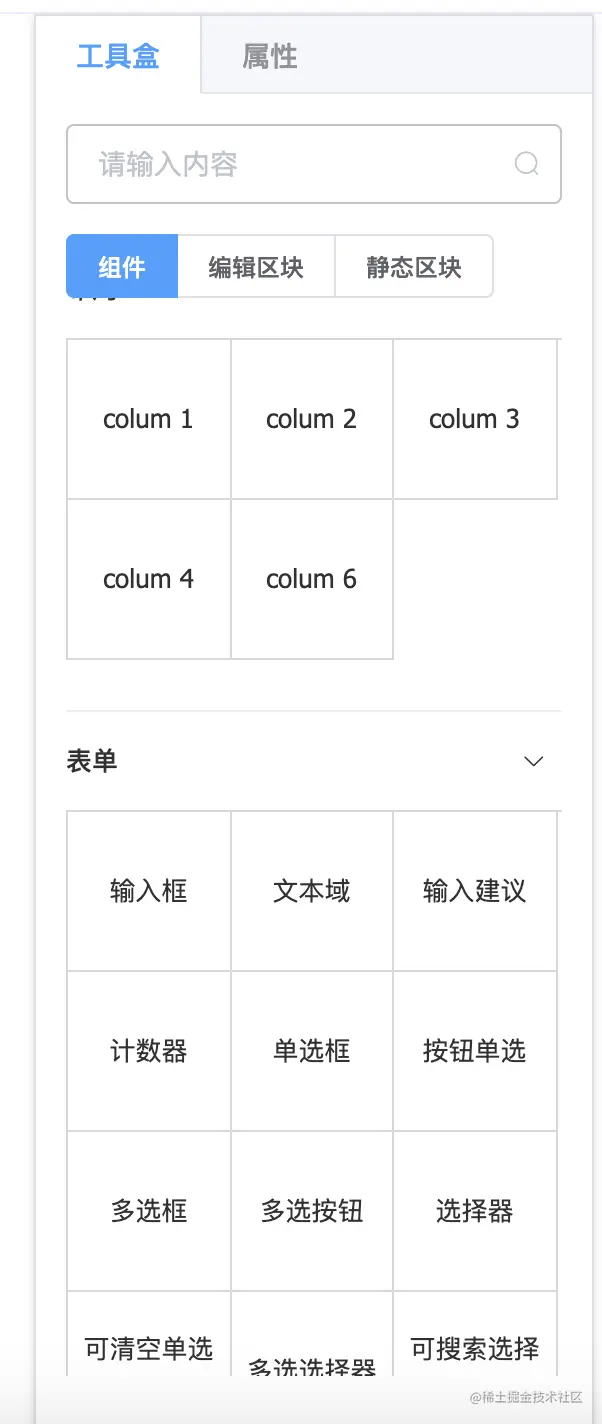 操作界面负责基础操作、预览工程和代码转换工程中间桥梁、拖拽实现、物料展示、自定义配置等工作;配置区域使用 json schema 渲染配置界面,配置数据如下