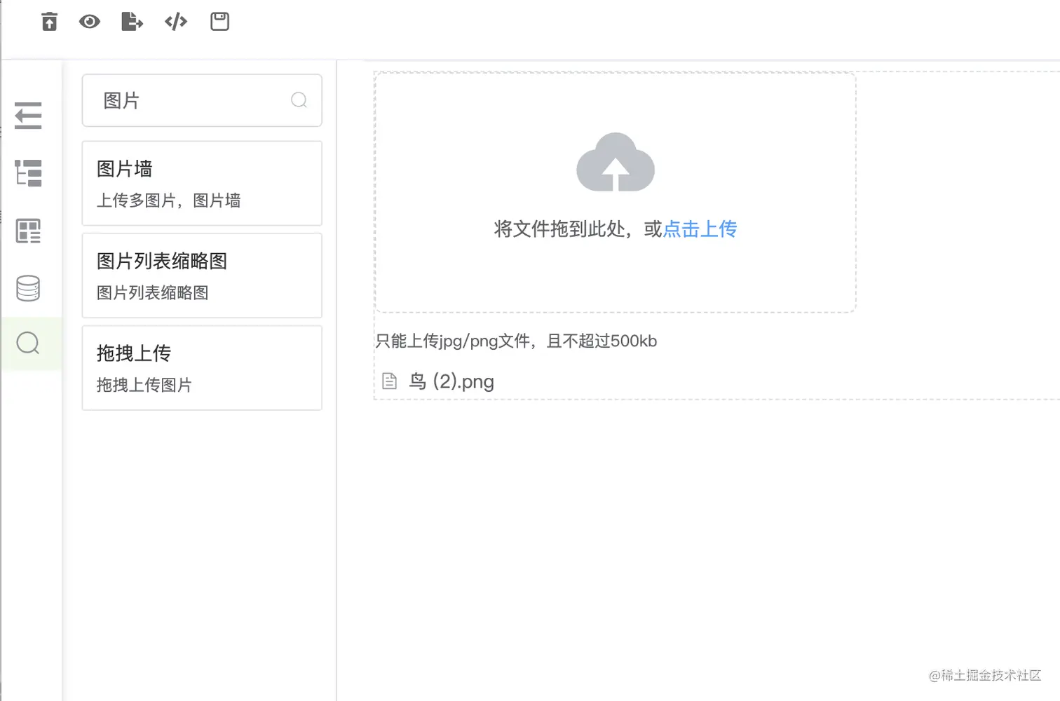 通用组件明显用起来较麻烦,需要自己配置,开发者都比较懒就想点吧点吧就用,所以提供场景组件,场景组件可以自带功能自带场景,如图搜索“图片”,出现图片墙、图片列表、图片拖拽选择适合业务需要的场景直接用就可以了。目前组件还较少,后续会进一步扩充组件种类。