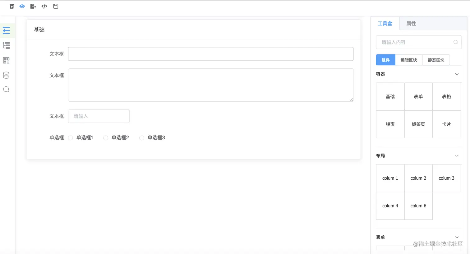 通用组件提供vue element-ui里的组件,可拖拽或点击到预览区实时预览,提供配置能力,此部分灵活通用,但提效不明显,很多同类产品都实现到这步,不太受开发者欢迎,如果只到这里我自己也没有太大动力用。