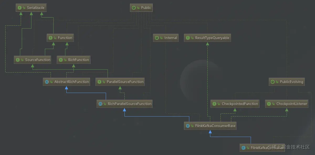 上述代码是FlinkKafkaConsumerBase的部分代码片段,基本上对其做了详细注释,里面的有些方法是FlinkKafkaConsumer继承的,有些是重写的。之所以在这里给出,可以对照FlinkKafkaConsumer的源码,从而方便理解。