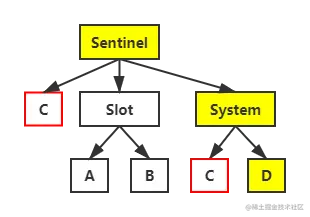 对于两个红框空间,如果从外部引用,(绝对)引用路径分别为 Sentinel::C 与 Sentinel::System::C ;如果从 D 引用,相对引用路径都为 C 。那么,这两个空间到底是不是一个空间呢?