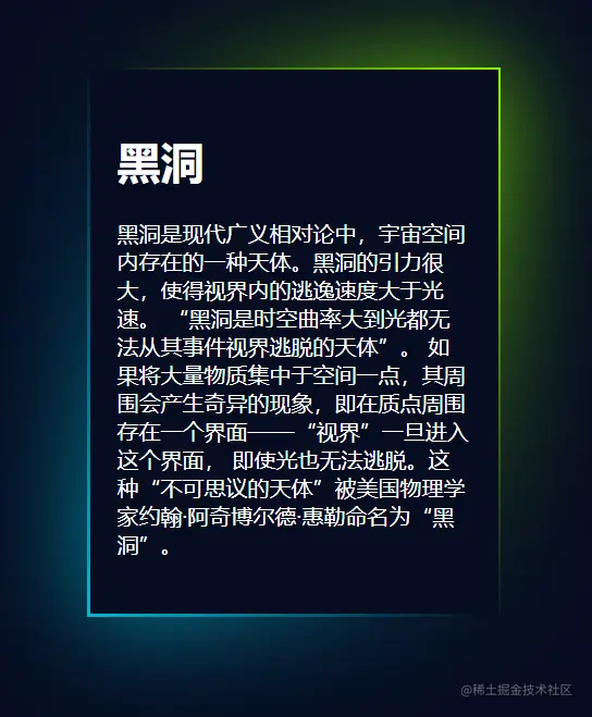 最近浏览b站,偶然发现一个有趣的前端小实验-----边框发光效果。 原视频地址,但是没有教学视频,特此研究一下。