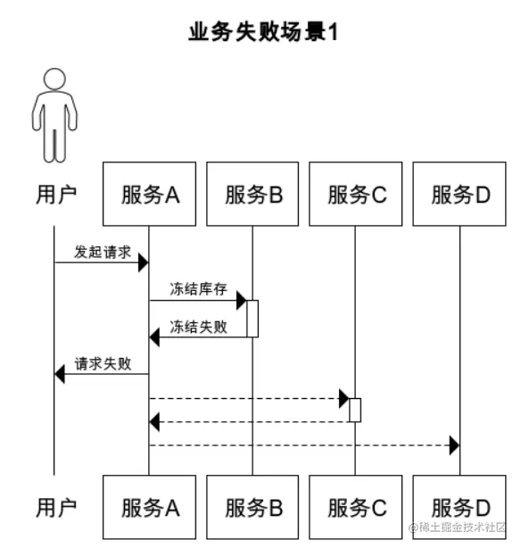 - 当调用服务B冻结库存失败则终止并回滚数据库。