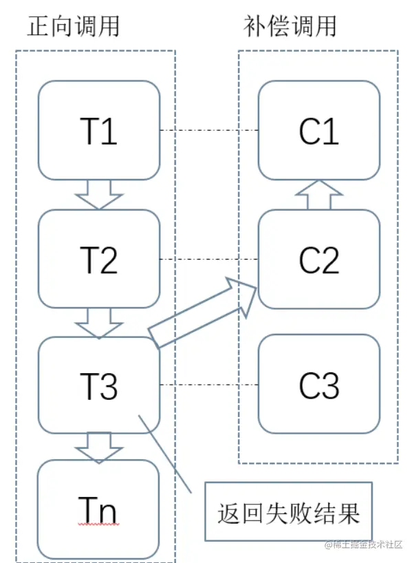 「补偿协议」:在Saga模式下,分布式事务内有多个参与者,每个参与者都是正向补偿服务。上图中的T1~Tn就是「正向调用」,C1~Cn是「补偿调用」,正向调用和补偿调用是一一对应的关系。假设有n个被调用方服务,T1就是对服务一的调用,接着T2是对服务方二的调用,T3是对服务方三的调用。如果这个时候返回了失败,那么就需要进行回滚,此时就会调用T2的对应补偿C2,调用T1的对应补偿C1,使得分布式事务回到初始状态。