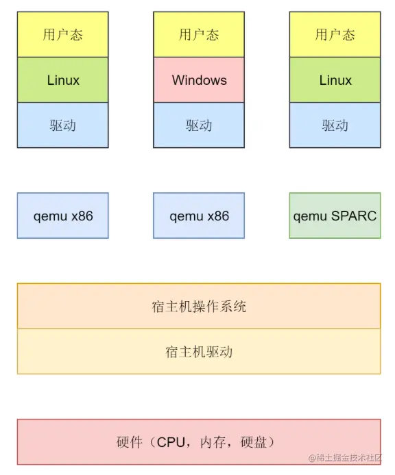 qemu 向 Guest OS 模拟 CPU,也模拟其他的硬件,GuestOS 认为自己和硬件直接打交道,其实是同 qemu 模拟出来的硬件打交道,qemu 会将这些指令转译给真正的硬件。由于所有的指令都要从 qemu 里面过一手,因而性能就会比较差。