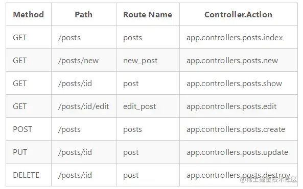 上面代码就在 /posts 路径上部署了一组 CRUD 路径结构,对应的 Controller 为 `app/controller/posts.js` 接下来, 你只需要在 posts.js 里面实现对应的函数就可以了。
