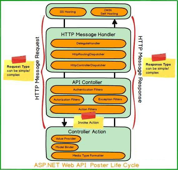 ASP.NET Web API核心的消息处理管道独立于ASP.NET平台,比Asp.NET MVC设计的管道更为复杂,功能也更为强大,支持Web Host和Self Host(任意类型的应用程序,如控制台、Windows Form应用程序、WPF应用甚至Windows Service)两种寄宿方式,本文主要介绍第一种方式。Web API整个生命周期如下图所示。