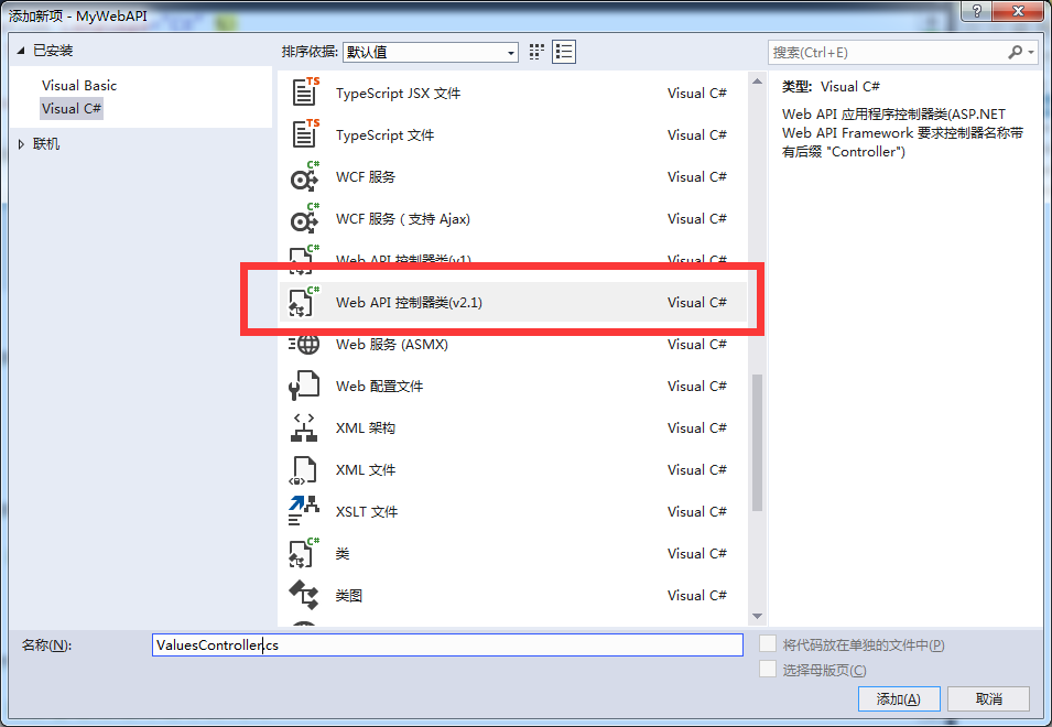 右键项目,添加新建项,选择Web API控制器类,如下图所示。