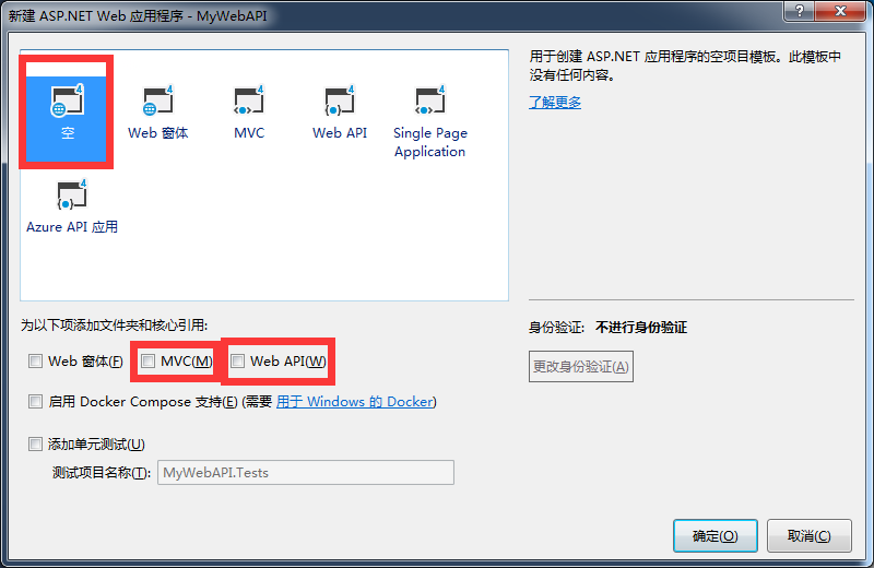 选择空项目,同时去掉MVC及Web API选项,如下图所示。