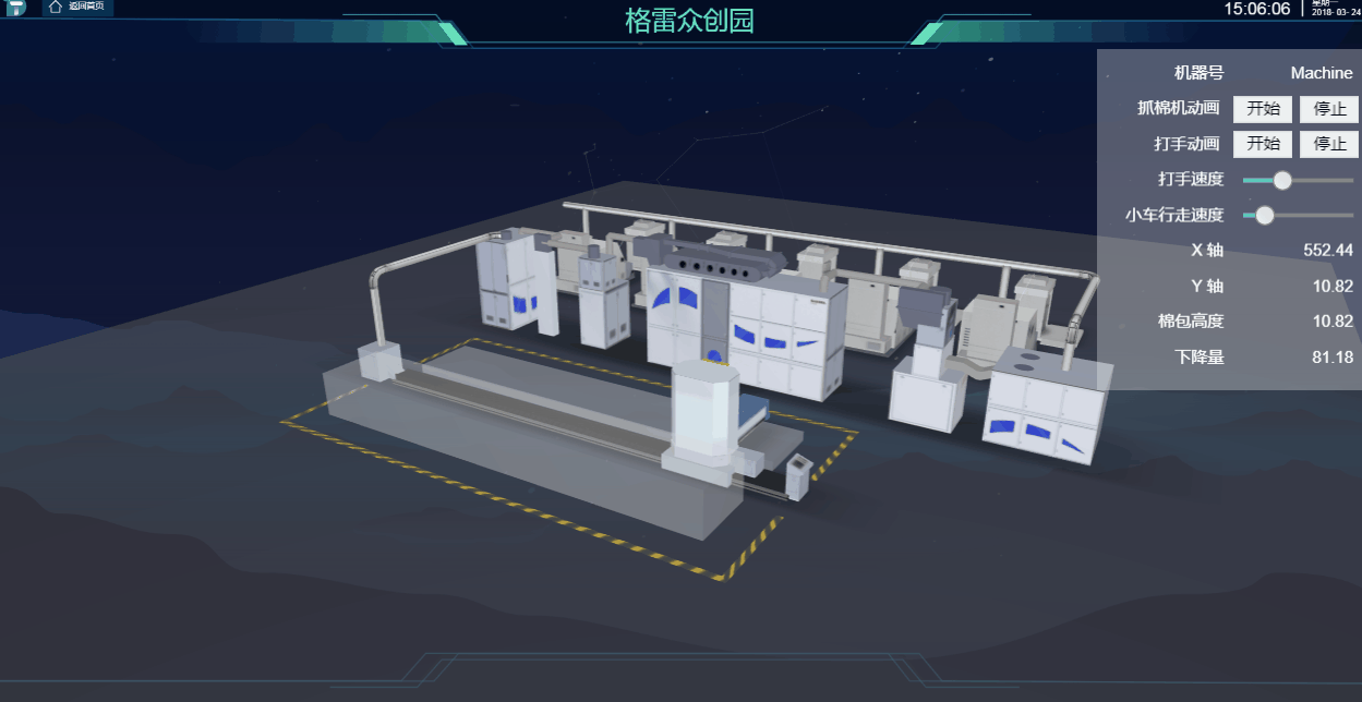 棉花加工 3D 工厂场景监控系统不仅能实现生产监控全过程一体化、精细化、可视化、数字化的管理,集成企业现有的设备系统,及时发现问题、解决问题,让生产线全过程透明简单化,在生产过程中可控可管理,通过模型与对接的数据,反馈出运行状态,并且可以通过面板来控制抓棉机的运行,提升用户的体验度和管理。