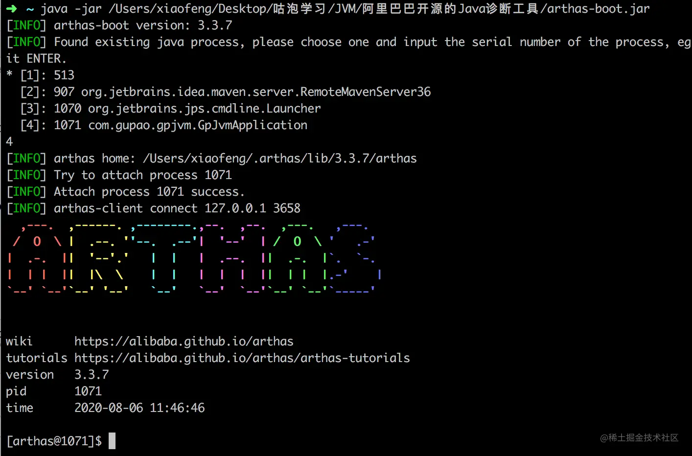 这个问题是当前Java环境变量配置的是JDK10,所以arthas运行环境是Java10,但是项目里用的是JDK8,所以把环境变量中Java变量改一下 vi ~/.bash_profile 改一下,重新用jdk8来启动arthas. 启动成功界面如下:
