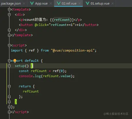 setup()中创建响应式数据:import { ref } from '@vue/composition-api' setup() { const count = ref(0) return { count, name: ref('zs') } } -