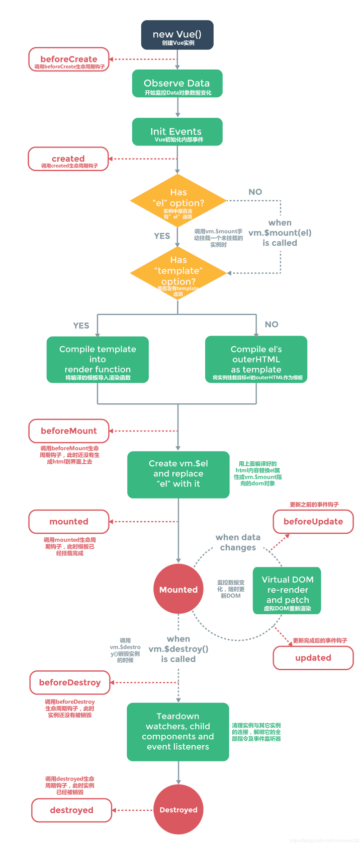 vue实例从开始创建、初始化数据,编译模板、挂载DOM 渲染、更新、卸载等一系列过程,称为Vue的生命周期,可以分为创建前后、载入前后、更新前后、销毁前后。