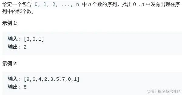 例如一个长度为9的数组[0,1,3,4,5,6,7,8,9], 将其扩展为[0,1,3,4,5,6,7,8,9,0],然后对数组元素和下标进行异或,即0^0^1^1^2^3^3^4^4^5...8^9^9^0,得到结果2即为缺失值