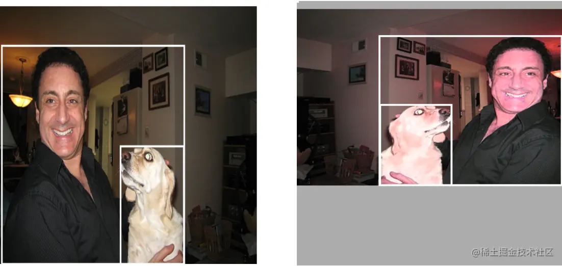 右图是我用VOC2007数据集中的一张图片,包含人和狗两个目标以及相应的框框,左图是我们进行数据增强之后得到的一张新的图片,我们可以看到我们的原图的宽高被扭曲、尺寸被缩小了、图片被翻转、图片的色域也发生了变化,但是目标以及框住目标的框框依然存在。