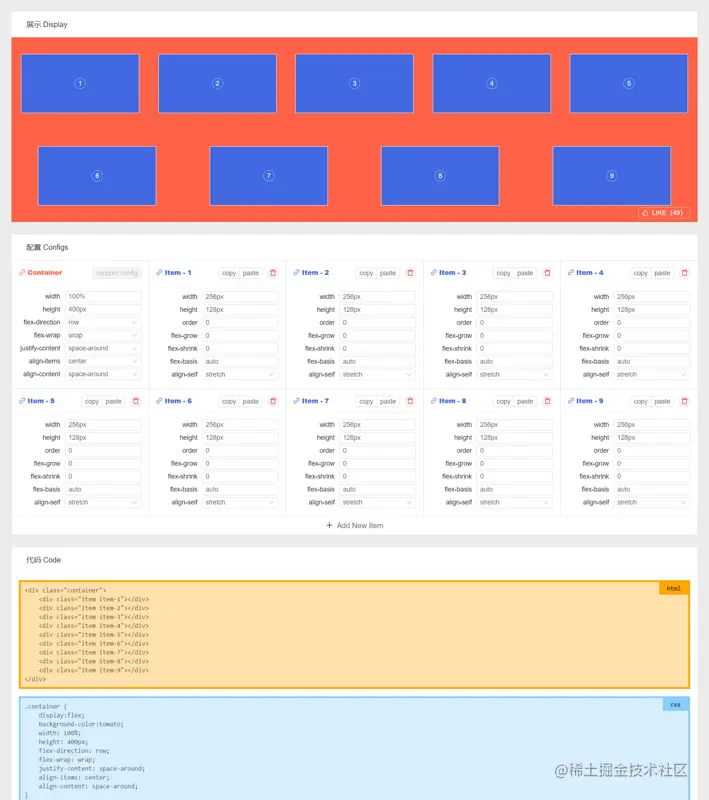 【项目】Flex布局在线调试工具 柯柯likeke 2020-08-06 7,536 阅读1分钟 介绍 Flex 布局的规则和语法请见该文。 技术栈:Vue + Antd。 这是一个支持在线调试 Flex 布局的工具: 鼠标移至 Flex 属性名或属性值上,会弹出相应的提示气泡框。 鼠标点击演示区域内的 Flex Item,会弹出快捷配置气泡框。 支持复制和粘贴 Flex Item 配置。 支持根据当前配置,自动生成 HTML 和 CSS 代码。 地址 在线地址。 仓库地址。