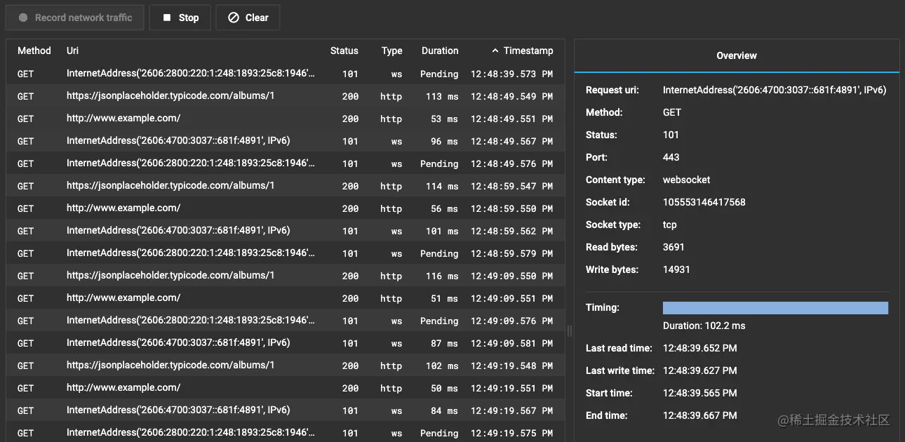 现在,“Network” 页面会将计时信息以及你的状态和内容类型等其他信息添加到应用中的 network calls 中。对详细信息UI进行了其他改进,以提供 websocket 或 http 请求中数据的概述。我们还为该页面提供了更多计划,包括 HTTP请求/响应主体和监视 gRPC 流量。
