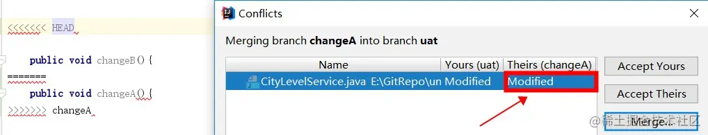 假设我们先把changeB分支合并至uat,然后把changeA合并至(合并了changeB分支的uat),此时就会出现冲突。