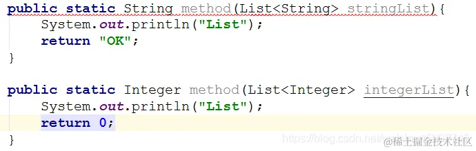 上面这段代码是不能被编译的,因为参数List<Integer>和List<String>编译之后都被擦除了,变成了一样的原生类型List<E>,擦除动作导致这两种方法的特征签名变得一模一样。