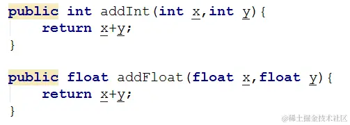 实际开发中,经常有数值类型求和的需求,例如实现int类型的加法, 有时候还需要实现long类型的求和, 如果还需要double类型的求和,需要重新在重载一个输入是double类型的add方法。