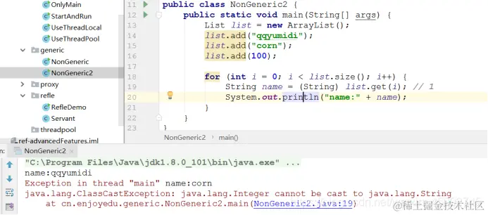 - 因此,//上图 取出集合元素时需要人为的强制类型转化到具体的目标类型,且很容易出现“java.lang.ClassCastException”异常。所以泛型的好处就是: 1)适用于多种数据类型执行相同的代码 2)泛型中的类型在使用时指定,不需要强制类型转换